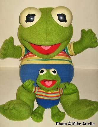 In 1986 Hasbro made a Jumbo sized Baby Kermit plush toy. As you can see it's quite huge! I've included the 12 inch Baby Kermit in the picture for size comparison. Jumbo Baby Kermit is 20 inches sitting. Hasbro was also producing Sesame Street plush toys at the same time and made a Jumbo Big Bird plush toy. I recall seeing both of them at the toy store next to each other on the same shelf. This Jumbo Baby Kermit was found at a thrift store in the mid 1990s. Even though this toy was mass produced, in my experience this jumbo Baby Kermit plush toy is super rare to find these days.