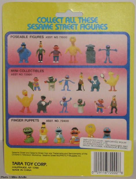 In addition to having "Muppets Inc." marked on the base of each of the puppets in this set they are also marked "Tara", as such it is certain that they were made by Tara Toys. None of the puppets are marked with a copyright date, however we know that they were made in the mid to late 1980's as they are shown on the back of the card packaging (shown below) for Tara Toys series of Sesame Street PVC figures along with Tara Toys' series of Sesame Street action figures. The card packaging for the PVC figures does not provide a copyright date, however the packaging for the action figures has a 1985 copyright date. I have never seen any of these finger puppets on a card. I recall that they were sold loose in a counter top box, which was a typical way to sell smaller toys and PVC figures at the time.